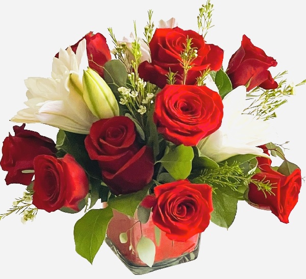 Red Roses and White Lilies arranged in a cube pot