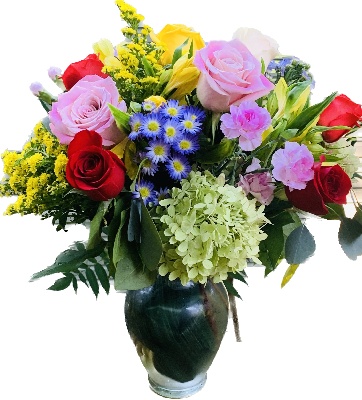 Pink Roses, Red Roses, Yellow Roses, Purple Montecasino, White Hydrangeas, Yellow Alstroemerias, solidago, Pink Mini Carnations