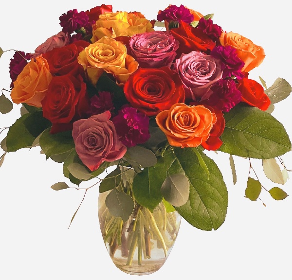Red Roses, Yellow Roses, Orange Roses, Lavender Roses and Purple Mini Carnations with a touch of Eucalyptus
