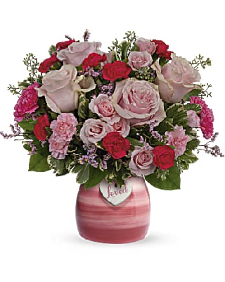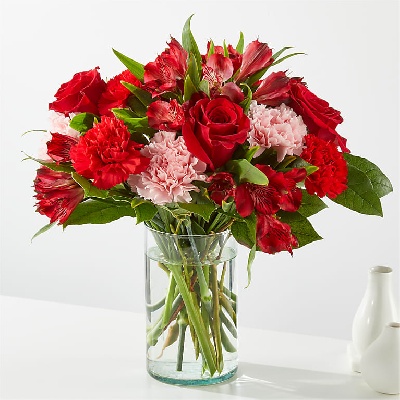pink spray roses, red alstroemeria, red carnations, pink and mini carnations
