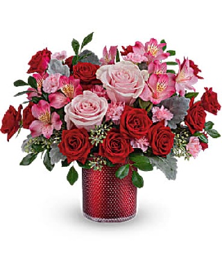 Red hot! Arranged with a ravishing all-red bouquet, this glass keepsake vase features a modern geometric pattern and pretty pearlescent finish.