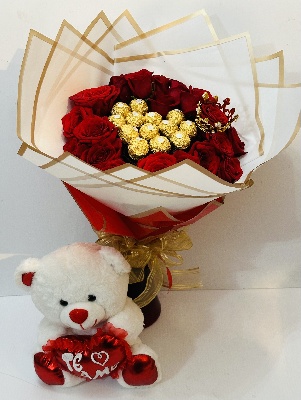 Wrapped bouquet of lovely red roses in a heart shape with delicious Ferrero Rocher chocolates with a sweet teddy bear