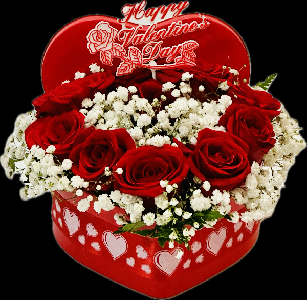 Red Roses and babies breath designed in a heart shape box