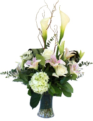 Gentle Spring: Pink Lilies, White Roses, White Hydrangeas, White Calla Lilies, Eucalyptus and Curly Willow