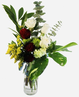 Glowing Beauty: Red Dahlias, White Roses, Solidago and Green Poms Buttons arranged with exotic greens