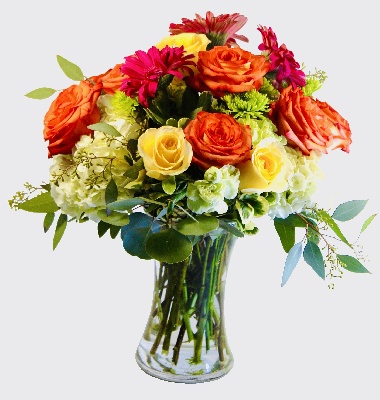 Delightfully Fresh: Yellow Lilies, Pink Gerbera Daisies, Orange Roses, Lavender Roses, Soft Yellow Roses, Yellow Calla Lilies and White Hydrangeas