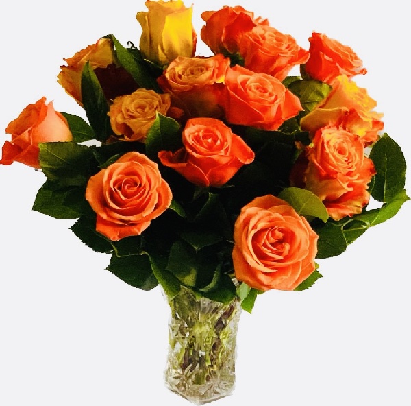 A mix of red, pink, coral and lavender roses is contrasted by an understated collar of green salal leaves
