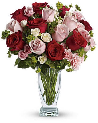 The lush bouquet includes red roses, pink roses, white spray roses and light pink spray roses accented with assorted greenery