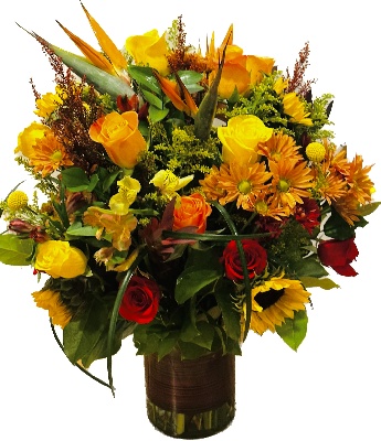 Orange Roses, Yellow Roses, Red Roses, Yellow Alstroemerias, Orange Alstroemerias, Solidago, Birds of Paradise, sunflowers, orange Daisies, and Red Poms