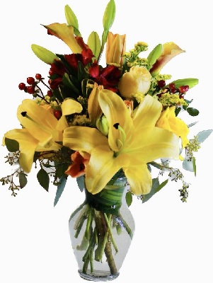 Yellow Lilies, Orange/Yellow Calla Lilies, Red Alstroemerias, Red Hypericum, Yellow Roses and Yellow Solidago