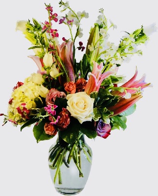 Pink Lilies, White Stock, Orange Spray Roses, Lavender Roses, White Roses