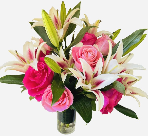 Soft pink roses, hot pink roses and pink lilies