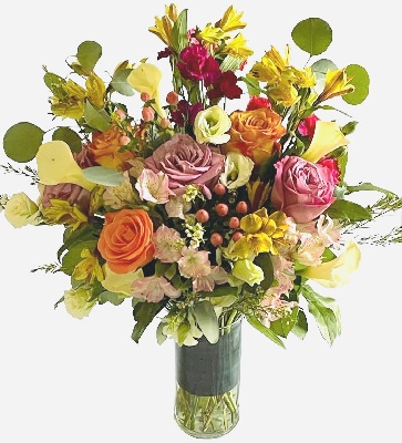 Orange Roses, Purple Roses, Yellow Alstroemerias, Pink Alstroemerias, Pink Hypericum, White Mini Carnations and White Mini Calla Lilies