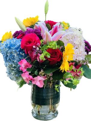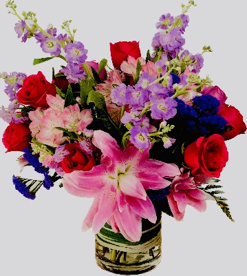 Pink Lilies, Hot Pink Roses, Red Roses, Blue Hydrangeas, Pink Hydrangeas, Pink Alstroemerias, Lavender mums, Yellow Gerberas, Pink Wax Flowers