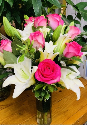 Hot Pink Roses and White Lilies