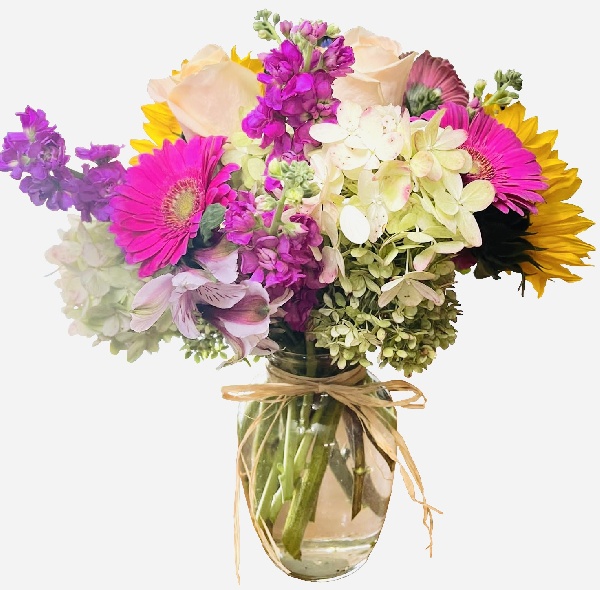 Pink gerbera daisies, lavender stock, yellow sunflowers, peach roses and white hydrangeas