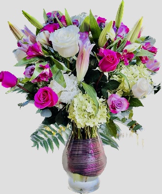 Hot Pink Roses, Purple Roses, White Roses, Pink Lilies, Pink Alstroemerias, Purple Alstroemerias and White Hydrangeas