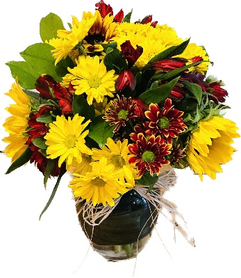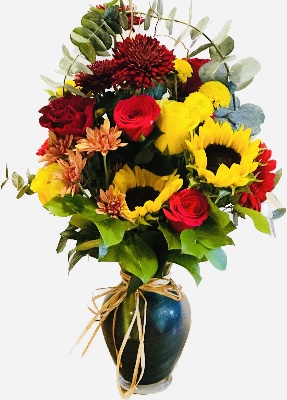 Sunflowers, Red Roses, Yellow Roses, Brown Mums, Orange Poms, Yellow Poms