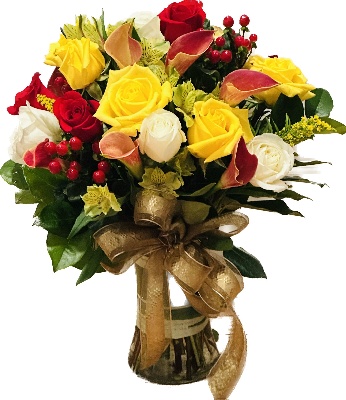 Red Roses, Yellow Roses, White Roses, Orange Calla Lilies, Red Hypericum, Yellow Alstroemerias and Solidago