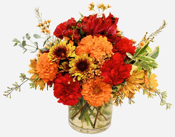 Fresh Autumn: Red Carnations, Orange Marigolds, Brown yellow Poms, Red Alstroemerias, Red Hypericums, Orange Daisies and Orange Wax Flowers