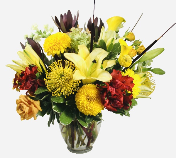 Endless Autumn: Yellow Protea, Yellow Calla Lilies, Yellow Lilies, Yellow Spray Roses, Yellow Roses, Red Alstroemerias, Yellow Poms Cushions, Safari Sunset and Fall Hydrangeas with accent of cattails
