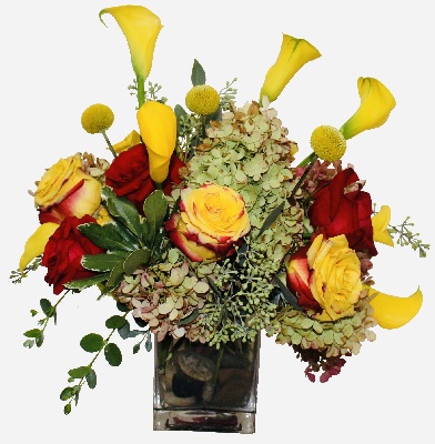 Fall Fantasy: Yellow Calla Lilies, Red Yellow Roses, Red Roses, Yellow Billy Balls and Fall Hydrangeas arranged in a square glass vase
