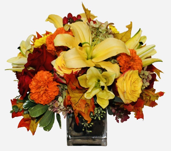 Pretty Harvest: Bouquet of Yellow Lilies, Yellow Roses, Red Roses, Orange Marigolds, Yellow Poms and Fall Hydrangeas arranged in a square vase