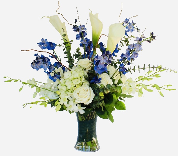 Deja Vu: White Calla Lilies, White Hydrangeas, White Roses, White Dendrobium Orchids and Blue Delphinium