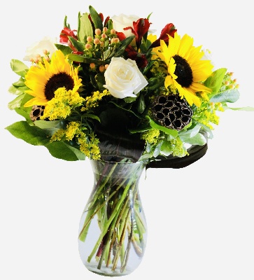 White Sunshine: Sunflowers, White Roses, Red Alstroemerias, Orange Hypericums and Solidago with an accent of Lotus