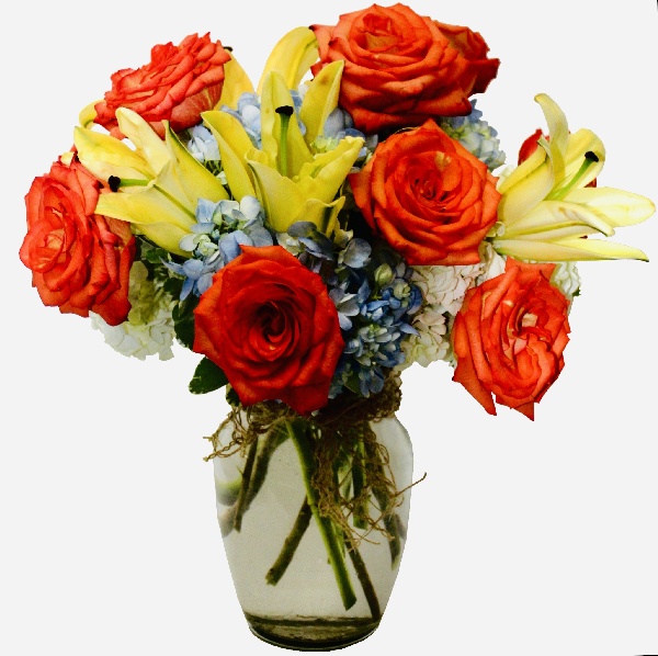 Delicately Attractive: Orange Roses, Yellow Lilies, Blue and White Hydrangeas