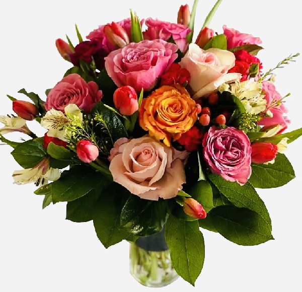 Pink Roses, Orange Roses, Purple Roses, White Alstroemerias, Red Tulips, Pink Mini Carnations and White Wax Flowers