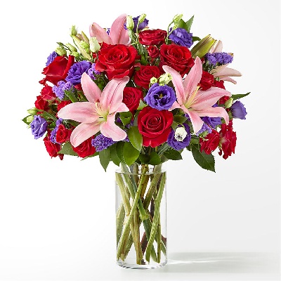 Pink hydrangea, hot pink roses, red roses, dark pink lilies, dark pink alstroemeria, and red carnations