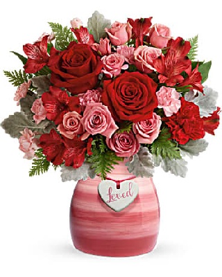 pink spray roses, red alstroemeria, red carnations, pink and mini carnations