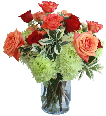 Radiant Love: Red Roses, Peach Roses, Orange Roses and White Hydrangeas