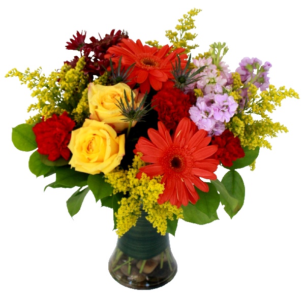 Radiantly Perfect: Yellow Roses, Orange Gerberas, Pink Stock, Red Carnations, Lavender Daisys and Yellow Solidago