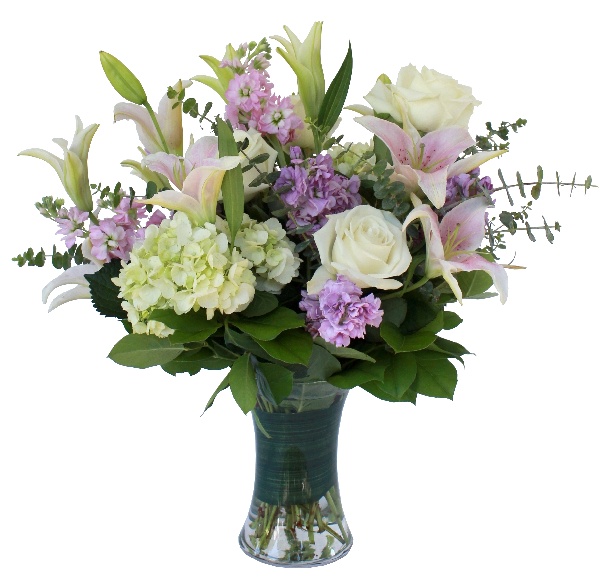 Sweet N Delicate: Pink Lilies, White Roses, Pink and Lavender Stock, White Hydrangeas and Eucalyptus