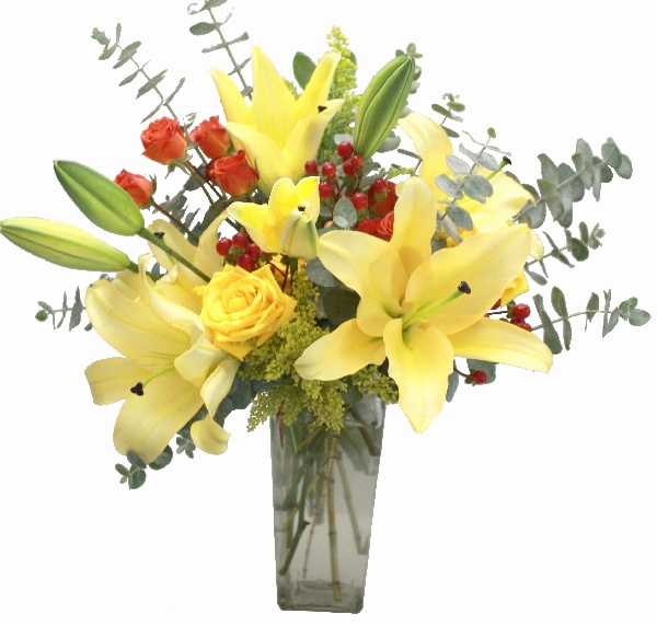 Shooting Star: Yellow Lilies, Yellow Roses, Orange Spray Roses, Red Hypericums, Solidago and Eucalyptus