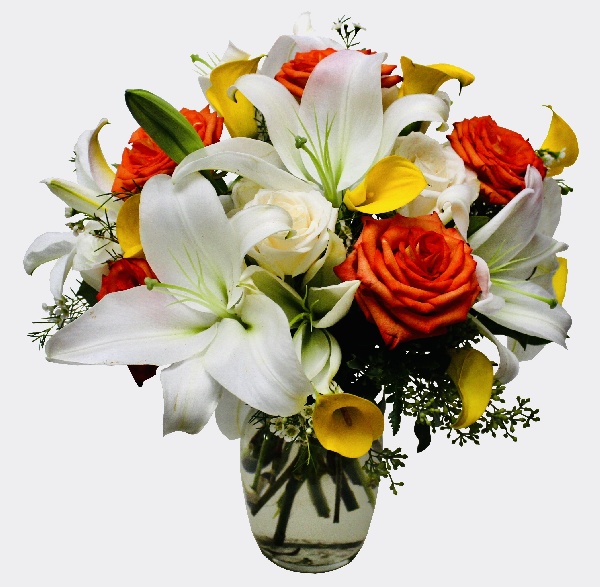Natures Essence: White Lilies, Yellow Calla Lilies, Orange and White Roses