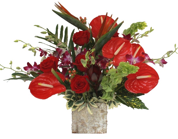 Unforgettable: Red Roses, Lavender Dendrobium orchids, Birds of paradize, Bells of Ireland, Brown Leucadendrom and Hipericums