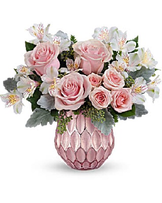 Soft and sweet pastel pink rose bouquet gets the glam treatment from a frosted glass vase with sculpted design and sparkling, faux mercury glass finish.