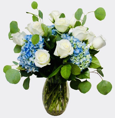 Angelic Beauty: White Roses and Blue Hydrangeas with accent of Eucalyptus