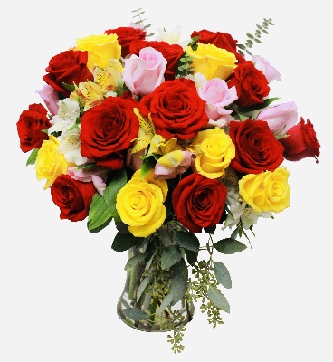Red Roses, Pink Carnations, Pink Alstroemerias and Yellow Poms