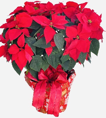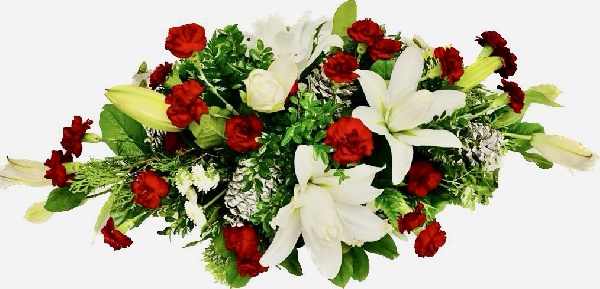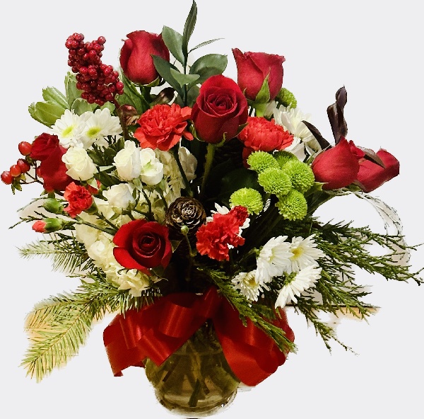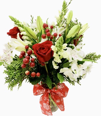 Red Roses, White Lilies, White Daisies, Red Hypericum, Green Pomps, Red Mimi Carnations arranged with mix of Christmas Greenery