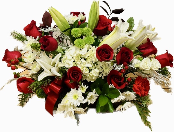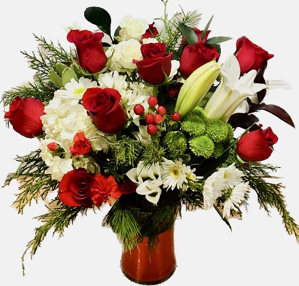 Red Roses, White Lilies, Red Hypericum, Green Pomps, Red Mimi Carnations, White Hydrangeas, White Daisies arranged with mix of Christmas Greenery