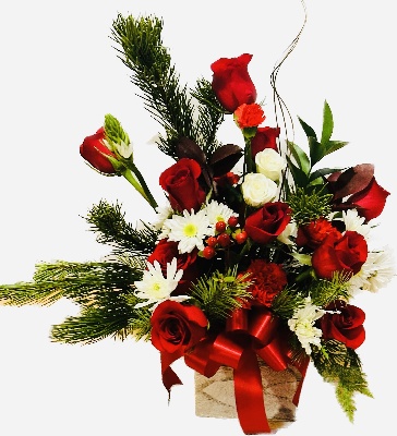 Red Roses, White Daisies, Red Hypericum, Red Carnations arranged with mix of Christmas Greenery