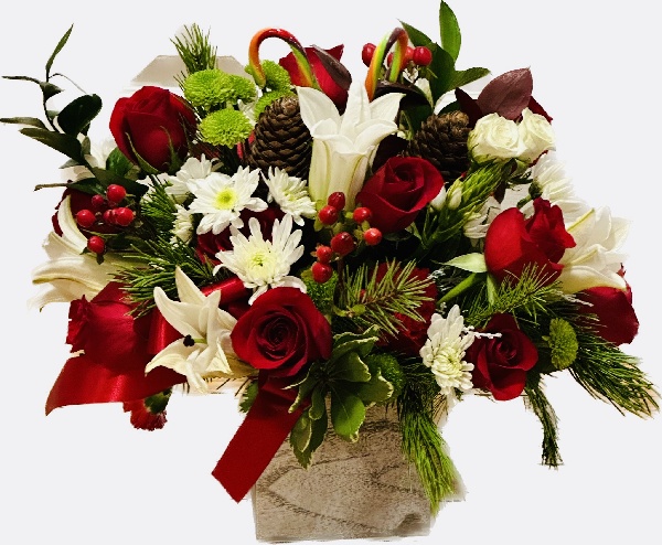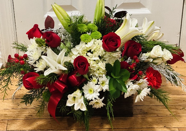 Red Roses, White Lilies, Red Hypericum, White Daisies, Red Carnations arranged with mix of Christmas Greenery