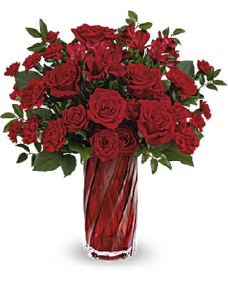 Red roses, white lilies, white daisy spray chrysanthemums, mini red carnations and sprigs of bupleurum and salal are presented in a graceful red glass vase