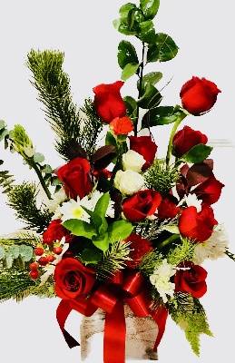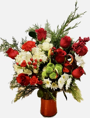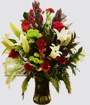 Red Roses, White Lilies, Red Hypericum, Green Pomps, Red Mimi Carnations arranged with mix of Christmas Greenery