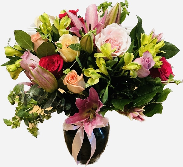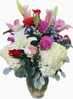 Pink Lilies, Hot Pink Roses, Red Roses, Blue Hydrangeas, Pink Hydrangeas, Pink Alstroemerias, Lavender mums, Yellow Gerberas, Pink Wax Flowers