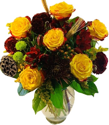 Yellow Roses, Brown Mums, Orange Hypericum, Red Alstroemerias and Yellow Solidago